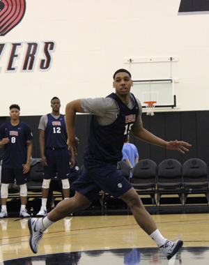 Team USA had a couple of practices against some local (Oregon) players, just about all of them having played college basketball. Standing at around 6-feet tall and having participated in a couple of Team USA mini camps, 16-year old sophomore Payton Pritchard was the lone high school product. Already a two time State champion and this years Oregon 6A player of the year, Pritchard did not look out of place at all once he came into the game. His confidence and poise were both on full display in front of a room full of NBA scouts, as he scored a three, a couple of strong drives to go along with a handful of assists and steals. Generally considered a top 50-prospect in the HS Class of 2016, if this were an audition for the 2016 version of Team USA at the Hoop Summit, Pritchard definitely put himself on the short list.